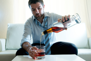 Businessman wearing blue shirt drunk at desk on white background Започнах да отказвам алкохола, след като дъщеря ми ми каза, че съм пияница